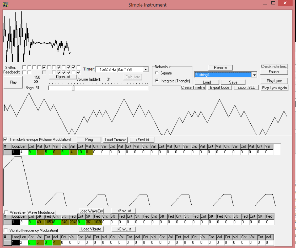 Chipper by sage is a very powerful tool for making sound effects and background music on the Lynx. Tweaking the parameters in Chipper creates all kind of waveforms, volume envelopes and frequency changes. In this page I try to document some working instruments.
